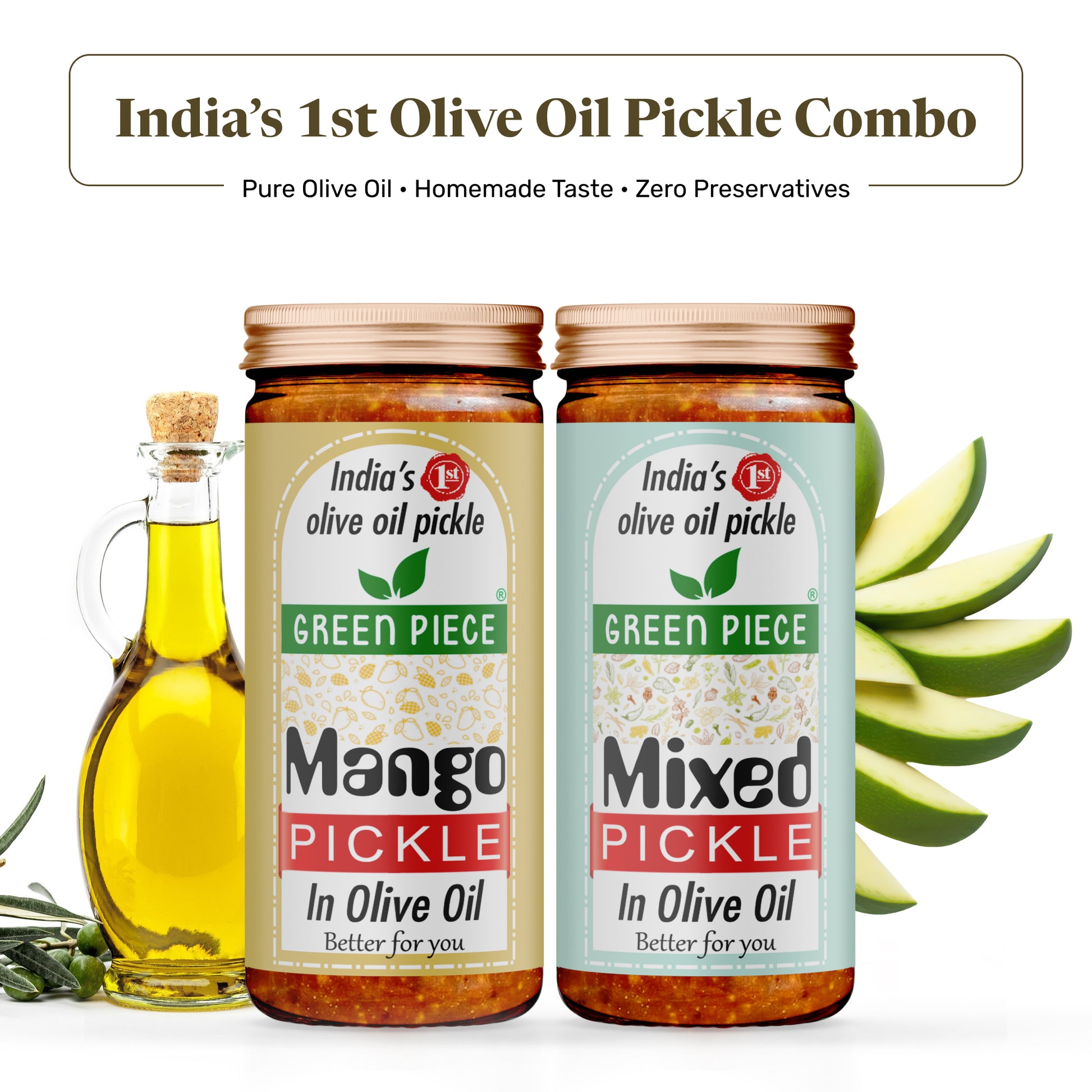 Introducing the Mango + Mixed Pickle Combo by Green Piece, a delicious duo that brings home the bold flavors of India with a healthy twist. Made using high-quality ingredients and preserved in heart-healthy olive oil, this combo packs the perfect punch of spice, tang, and tradition.